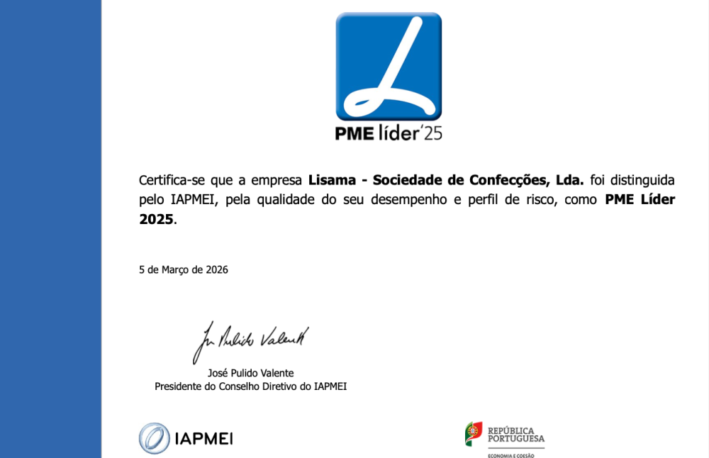 We are proud to share with our clients, employees, and partners that Lisama - Sociedade de Confecções, Lda. has been officially distinguished with the prestigious PME Líder 2025 (SME Leader) status. This distinction, awarded by IAPMEI in partnership with Turismo de Portugal, the Grupo Banco Português de Fomento, and the commercial banking sector, signals the quality of our performance and risk profile. It also highlights the importance of our contribution to the national economy. What does this recognition mean? For Lisama, achieving this status is more than just a seal of quality; it reflects our daily commitment to excellence and.